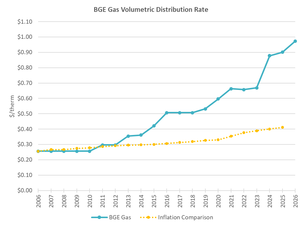Since 2010, gas delivery charges—to pay for the gas distribution system, not the gas itself—have increased from 26 cents per therm to 94 cents per therm (97 cents per therm as of February 1, 2026), nearly three times the inflation rate. Since 2020 alone, BGE’s gas distribution rates have increased 58 percent. A therm is the unit used to measure how much gas you use in your home.