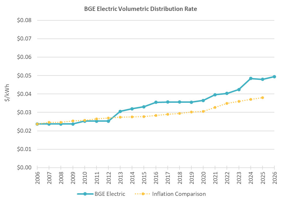 BGE’s electric delivery rates have also increased in recent years. Since 2010, rates have risen from 2.5 cents per kwh to 4.8 cents per kWh (4.9 cents per kWh as of February 1, 2026), about twice the inflation rate. Since 2020 alone, BGE’s electric delivery rates have increased 33 percent. A kilowatt hour (kWh) is the unit used to measure how much electricity you use in your home.