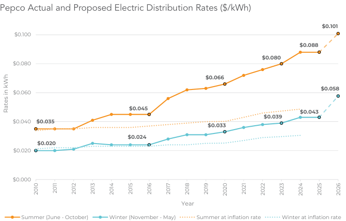 Since 2020, Pepco’s delivery charges—to pay for the distribution system, not the electricity itself—have increased 33 percent from 4.6 cents per kWh to 6.2 cents per kWh overall. A kilowatt hour (kWh) is the unit used to measure how much electricity you use in your home. Because Pepco’s summer rates apply for five months of the year and its winter rates apply for seven months, the overall rate reflects a weighted average of those two seasonal rates.